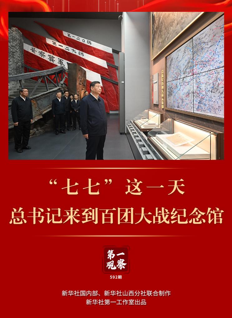 7月7日下午,习近平总书记在山西省阳泉市考察。他来到百团大战纪念碑广场,向百团大战烈士敬献花篮,参观百团大战纪念馆,缅怀抗战烈士英雄事迹,重温中国共产党领导抗日军民同仇敌忾、勇御外侮的光辉历史,了解当地开展革命历史教育、传承弘扬伟大抗战精神等情况。(新华社记者)
