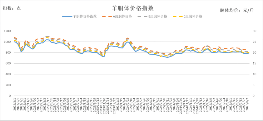 8月3日,羊胴体价格指数报788.83点,较上期上涨0.79%,a级胴体价格报21.60元/斤,较上期上涨0.15元/斤,涨幅0.68%;b级胴体价格报20.71元/斤,较上期上涨0.22元/斤,涨幅1.07%;c级胴体价格报20.00元/斤,较上期上涨0.08元/斤,涨幅0.40%。