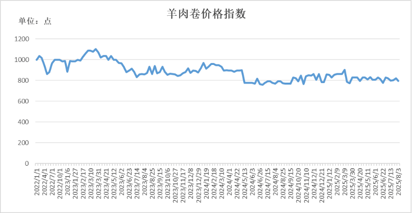 8月3日,羊肉卷价格指数报796.38点,较上期下跌3.06%,价格报46.19元/公斤,较上期下跌1.46元/公斤。