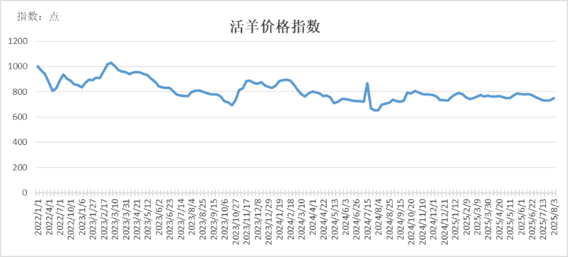 8月3日,活羊价格指数报749.17点,较上期上涨2.09%,价格报10.76元/斤,较上期上涨0.22元/斤。