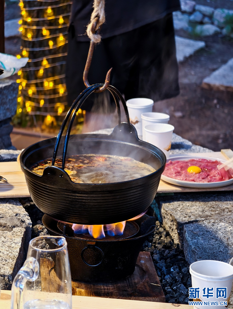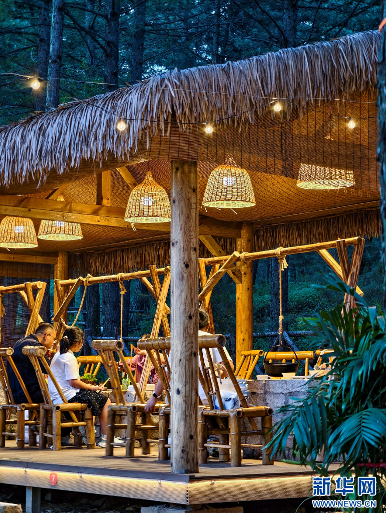 在吊炉火锅体验区,茅草屋顶下悬挂着竹编吊灯,绿植环绕,营造充满自然野趣的氛围。新华网 发