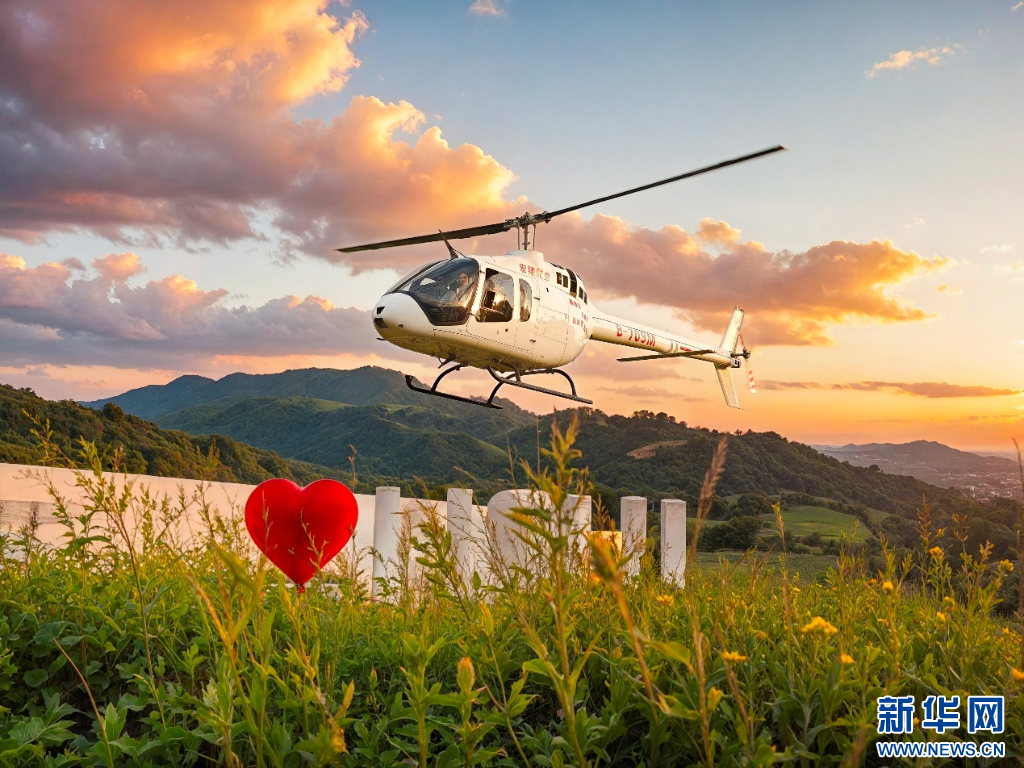 直升机在绚烂晚霞下腾空而起,换一个视角,欣赏大东沟的暮色。新华网 发