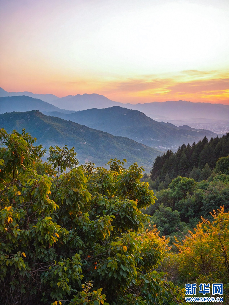 夕阳为山峦披上橙紫轻纱,远处层叠的山峰在薄雾中若隐若现。新华网 发