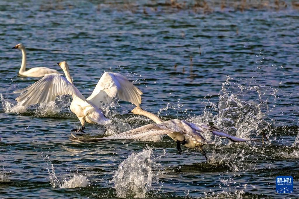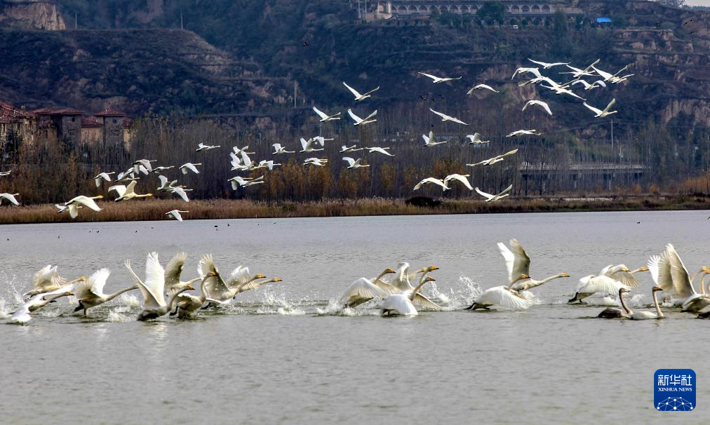 黄河水暖“鹅”先知。在山西平陆黄河湿地,成群结队的白天鹅在河面上练习起飞、降落、滑行,为“返乡”热身。它们时而引吭高歌,时而嬉戏打闹,洁白的身影与波光粼粼的水面相映成趣,构成了一幅和谐美丽的生态画卷。