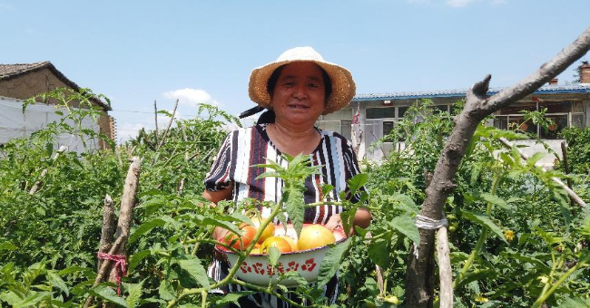 刘玉芬在自家小院采摘西红柿。 (张向荣 摄)