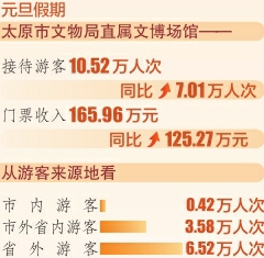 元旦假期,太原市文物局直属文博场馆接待游客10.52万人次,同比增加7.01万人次,实现门票收入165.96万元,同比增加125.27万元。从游客来源地看,市内游客0.42万人次,市外省内游客3.58万人次,省外游客6.52万人次。
