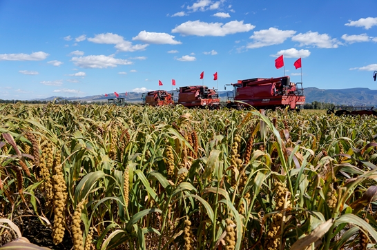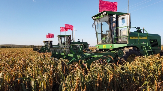 近日,山西省忻州市五寨县杂粮种植示范基地迎来谷子收获季,多台收割机、拣拾机往返于此,一派丰收景象。