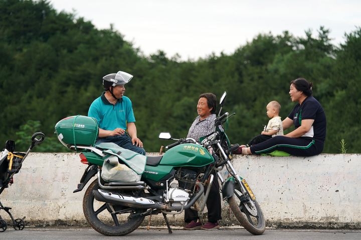 在山西省壶关县大峡谷镇鹅屋村,邮递员赵月芳和村民聊天(2022年7月13日摄)。