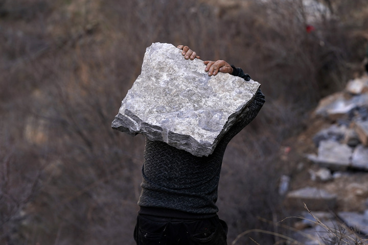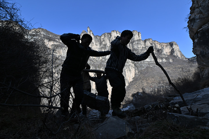在山西省壶关县大峡谷镇青龙峡村,村民们扛起石头准备运往修路现场(2023年3月7日摄)。