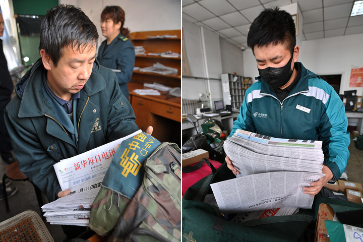 拼版照片:左图为2010年3月16日,邮递员王收秋把报刊放进邮包,准备出发送邮件;右图为2022年1月7日,王收秋的儿子王沄天邮政收投点整理报刊。