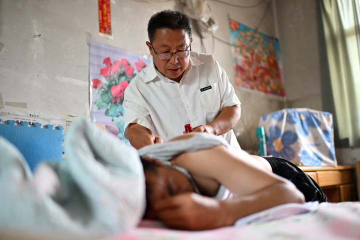 在山西省石楼县龙交乡德义河村,乡村医生辛平为村民换药(7月22日摄)。