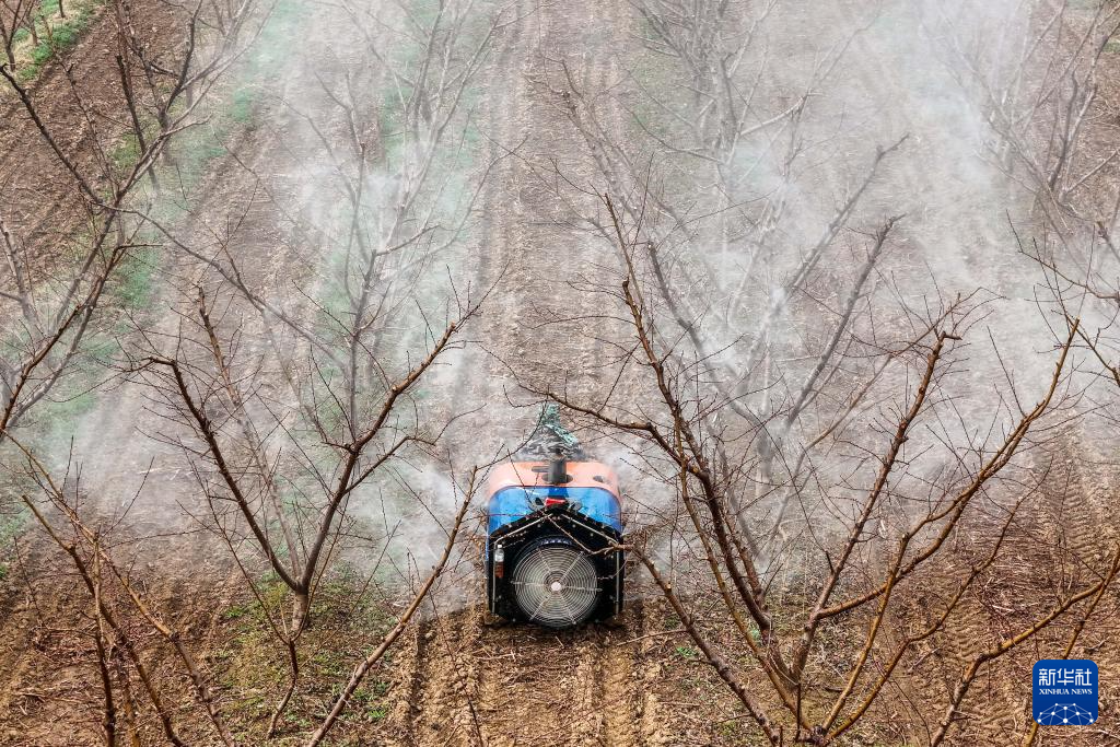 3月19日,山西省运城市平陆县张村镇的农民为果树喷洒农药(无人机照片)。