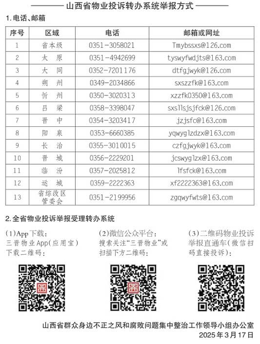 近日,省集中整治办聚焦“整治物业服务不履约不到位、侵占业主利益等问题并建立完善物业企业退出机制”实事项目,推动省住建厅打造了“山西省智慧物业管理服务平台暨全省物业投诉转办系统”,实现线上投诉、一键受理、销号审核和督办汇总等功能,省市县三级一体化运行,该系统已正式上线运行。为广泛听取群众意见,全面受理群众投诉,接受群众监督,现将全省各地电话、邮箱、“三晋物业”二维码等物业投诉举报渠道向社会公布如图。