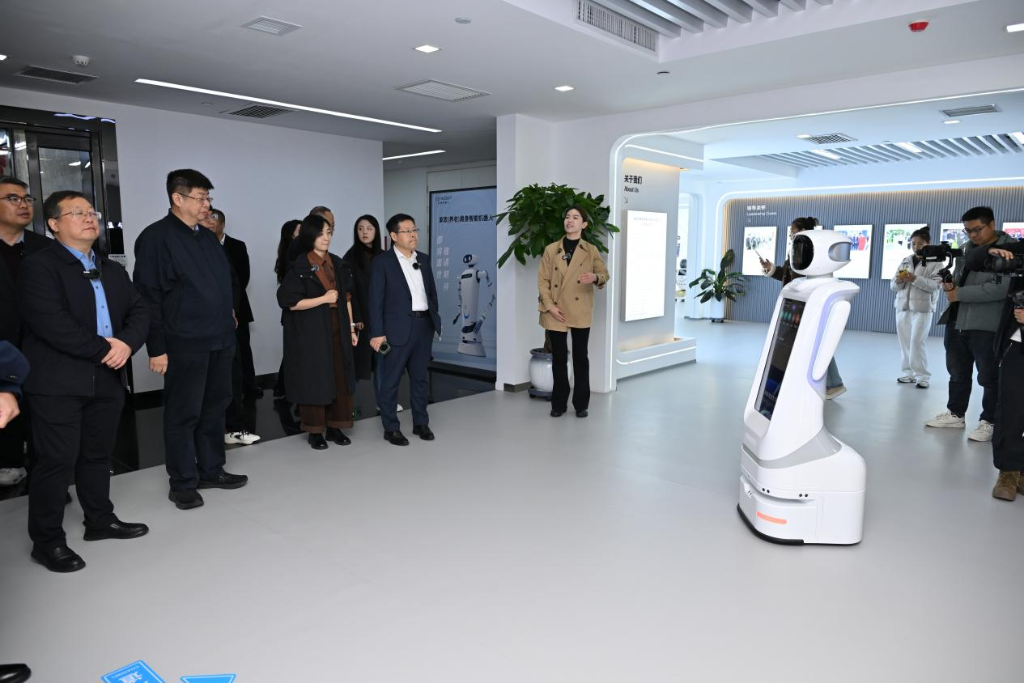 参加新华网思客年会的专家在临汾晋创谷调研,为他们讲解的是机器人。新华网 发(傅宇鹏 摄)