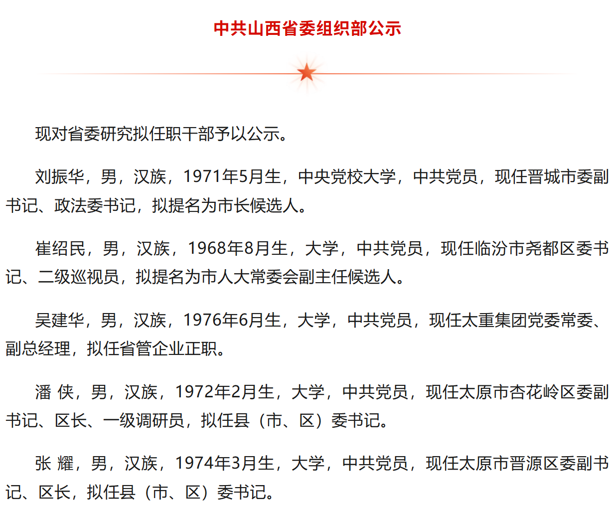 刘振华,男,汉族,1971年5月生,中央党校大学,中共党员,现任晋城市委副书记、政法委书记,拟提名为市长候选人。