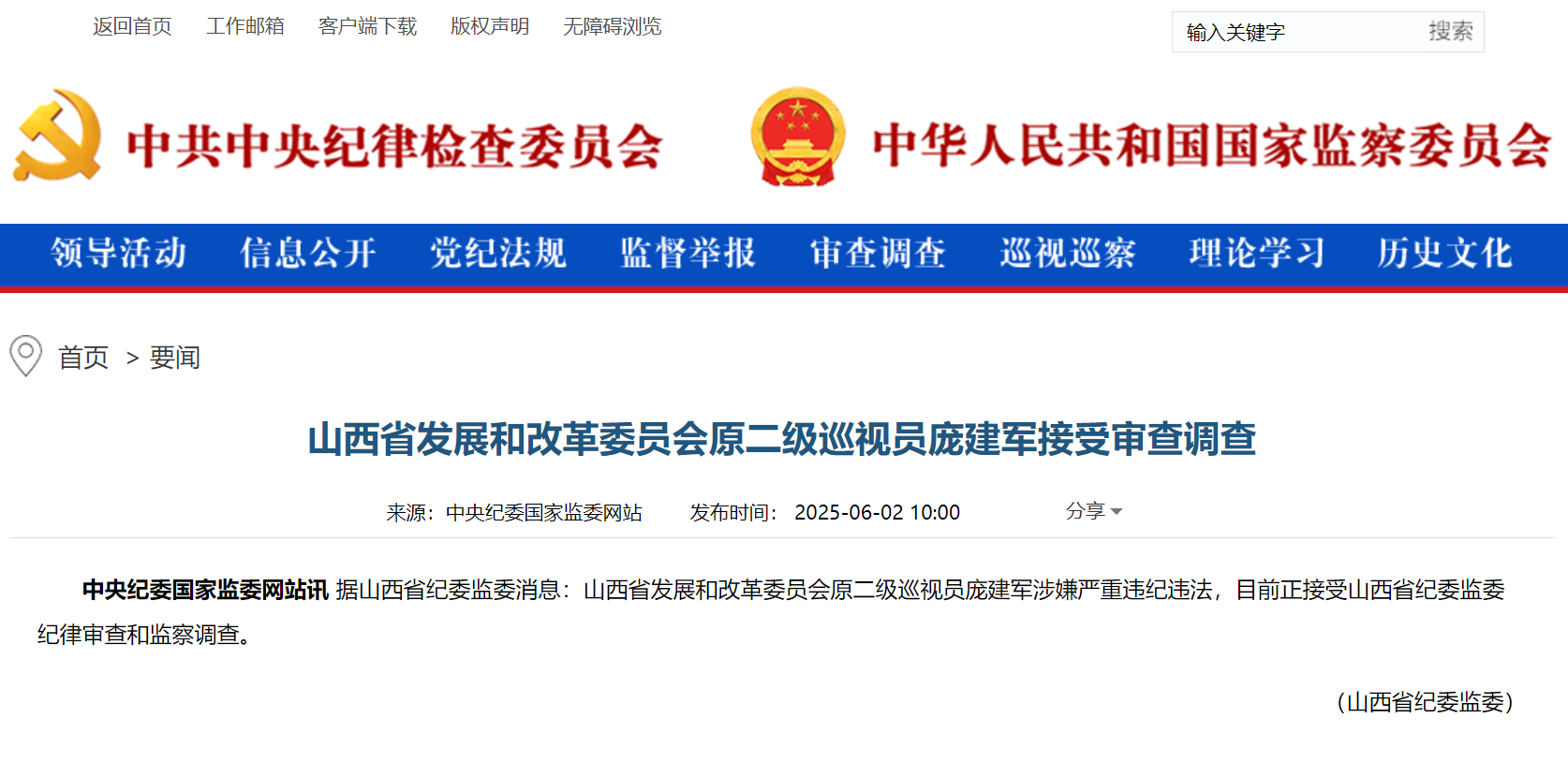 据山西省纪委监委消息:山西省发展和改革委员会原二级巡视员庞建军涉嫌严重违纪违法,目前正接受山西省纪委监委纪律审查和监察调查。(山西省纪委监委)