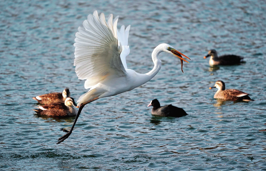 白鹭在太原市汾河觅食 (2025 年 1 月 1 日摄) 詹彦摄 / 本刊