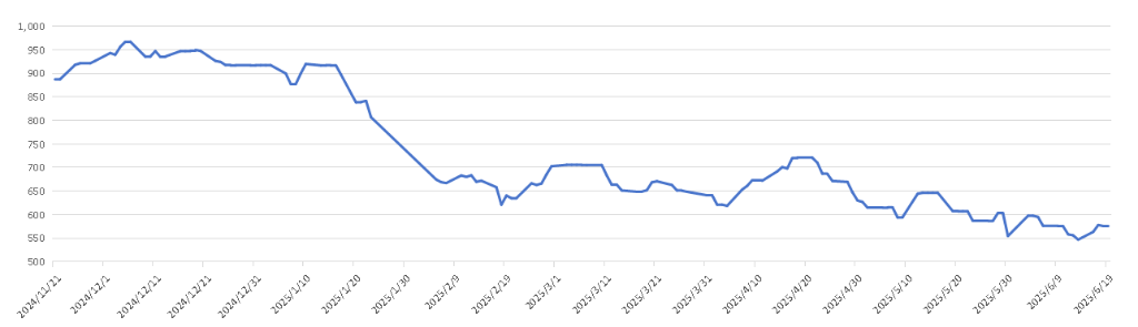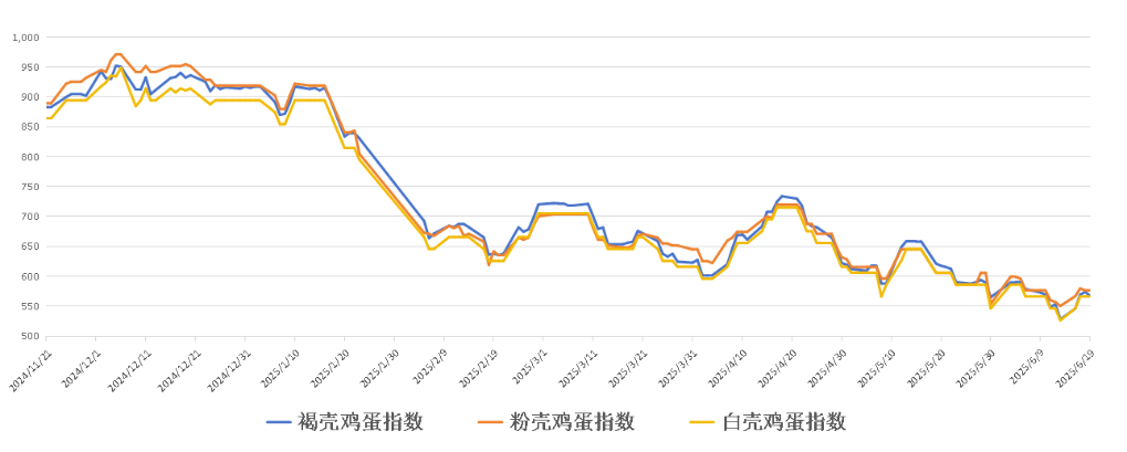 需求好转蛋价小幅上行。截至2025年6月19日,新华·稷山鸡蛋价格指数报575.03点,较上期(6月12日)上涨18.90点,涨幅3.40%,较基期(2023年8月1日)下跌424.97点,跌幅42.50%。