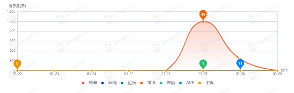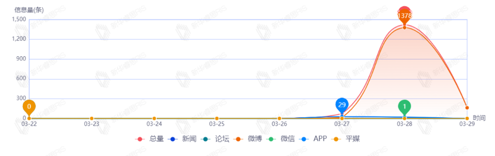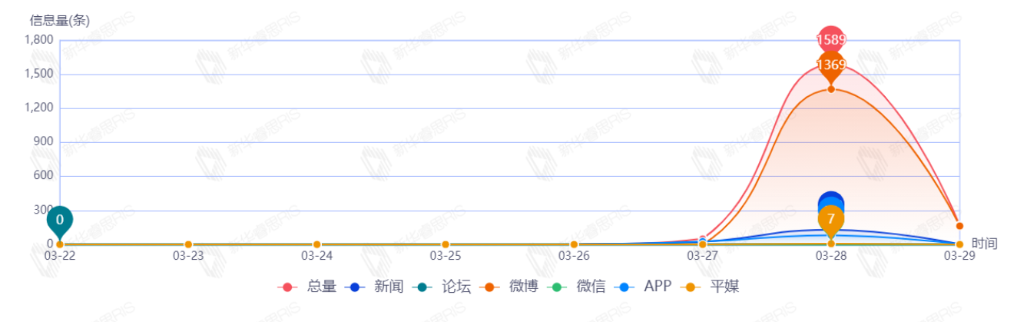 截至目前,该文章在互联网上传播总量共1653篇。其中,3月28日是传播的高峰期,共传播1420篇文章。各信源的信息发布情况中,微博信息占比最大,其次是app和新闻,占比分别为93.99%、3.10%、2.85%。(数据来源:新华睿思·数媒智慧分析平台)