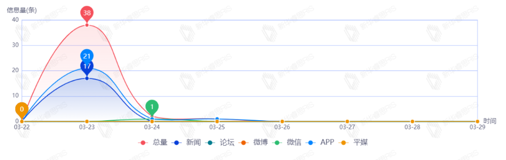 截至目前,该文章在互联网上传播总量共41篇。其中,3月23日是传播的高峰期,共传播38篇文章。各信源的信息发布情况中,app信息占比最大,其次是新闻和微信,占比分别为56.10%、41.46%、2.44%。(数据来源:新华睿思·数媒智慧分析平台)