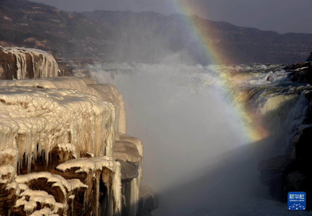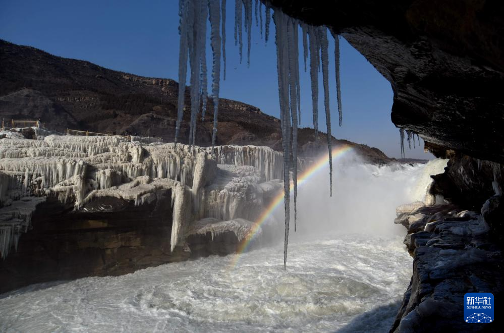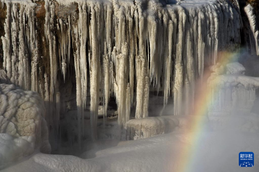 当日,位于山西吉县和陕西宜川县交界的黄河壶口瀑布出现“冰瀑飞虹”景观。