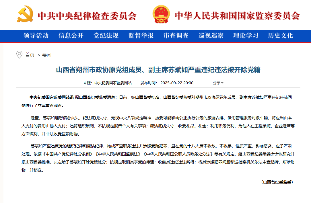 原标题:山西省朔州市政协原党组成员、副主席苏斌如严重违纪违法被开除党籍