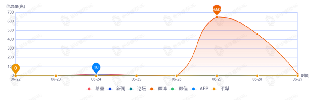 截至目前,该文章在互联网上传播总量1155篇。其中6月27日是传播的高峰期,共传播654篇文章。各信源的信息发布情况中,微博信息占比最大,其次是app和新闻,占比分别为98.01%、1.47%、0.52%。(数据来源:新华睿思数据云图分析平台)