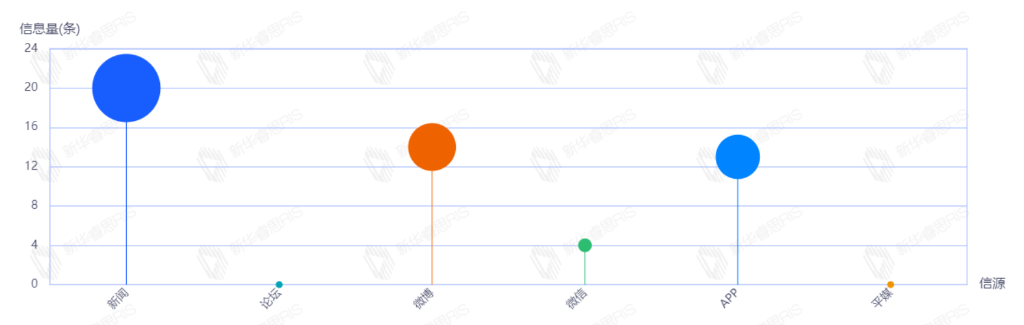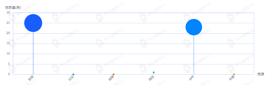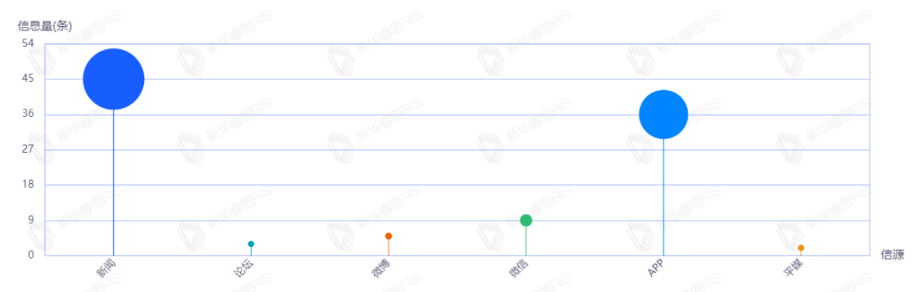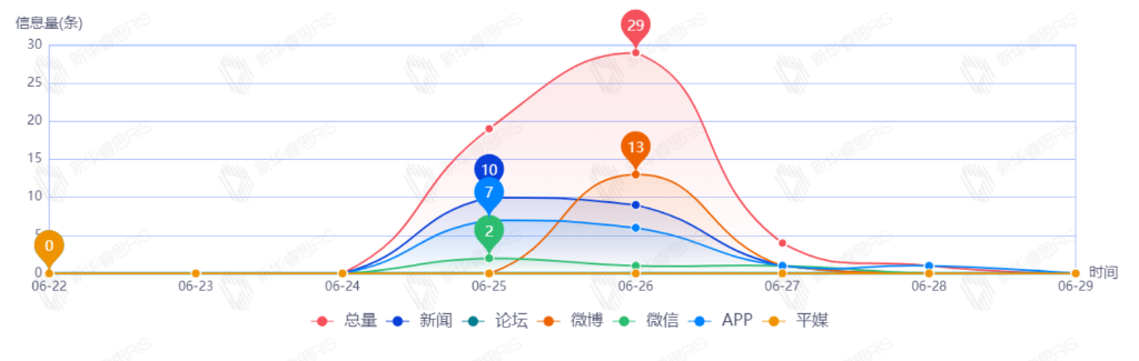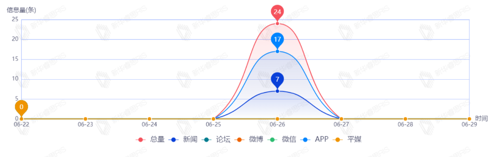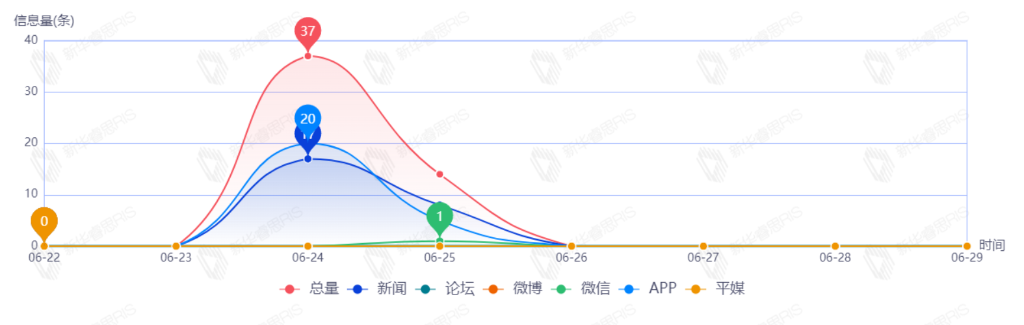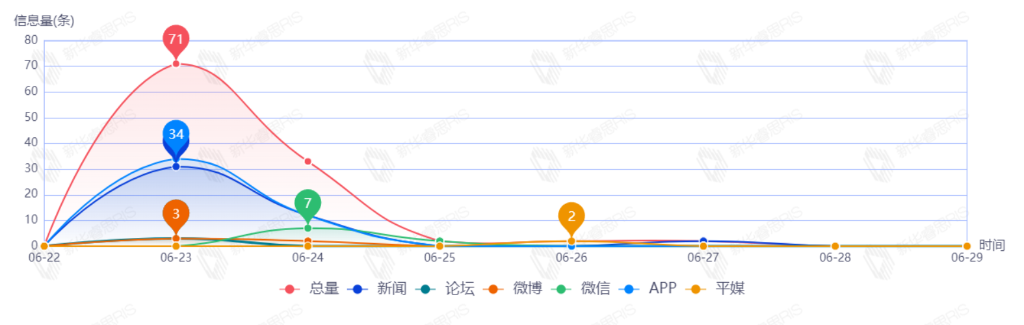 截至目前,该文章在互联网上传播总量110篇。其中6月23日是传播的高峰期,共传播71篇文章。各信源的信息发布情况中,新闻信息占比最大,其次是app和微信,占比分别为45.00%、36.00%、9.00%。(数据来源:新华睿思数据云图分析平台)