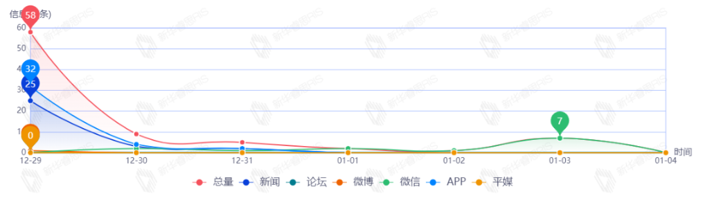 截至目前,该文章在互联网上传播总量共89篇。其中,1月1日是传播的高峰期,共传播48篇文章。各信源的信息发布情况中,新闻信息占比最大,其次是app和平媒,占比分别为58.54%、36.59%、3.66%。(数据来源:新华睿思数据云图分析平台)