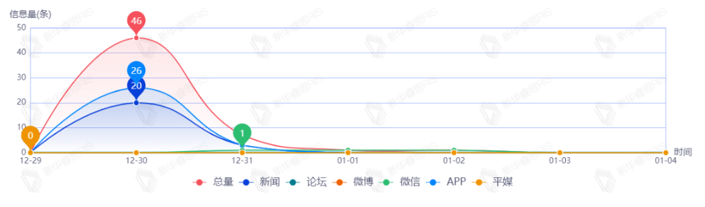 截至目前,该文章在互联网上传播总量共104篇。其中,12月29日是传播的高峰期,共传播50篇文章。各信源的信息发布情况中,新闻信息占比最大,其次是app和微博,占比分别为41.35%、33.65%、15.38%。(数据来源:新华睿思数据云图分析平台)