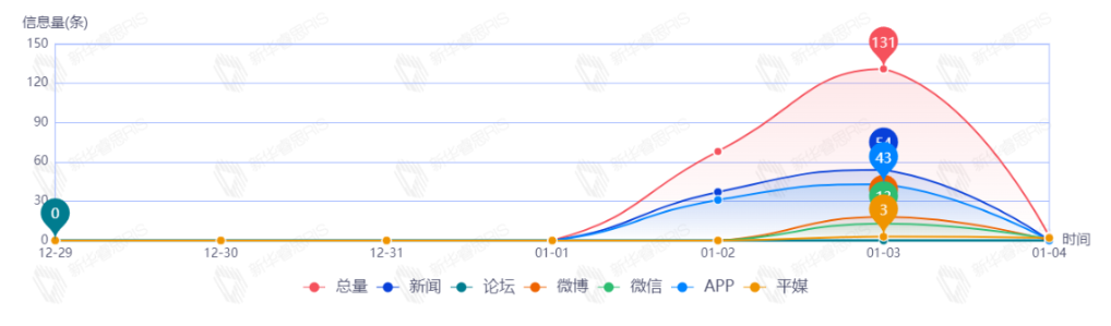 截至目前,该文章在互联网上传播总量共202篇。其中,1月3日是传播的高峰期,共传播131篇文章。各信源的信息发布情况中,新闻信息占比最大,其次是app和微博,占比分别为45.27%、36.32%、8.96%。(数据来源:新华睿思数据云图分析平台)