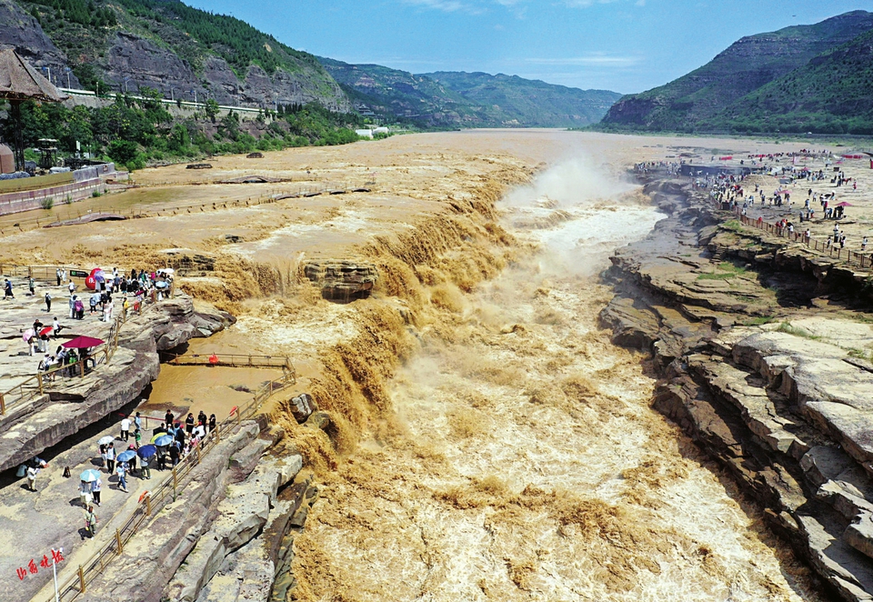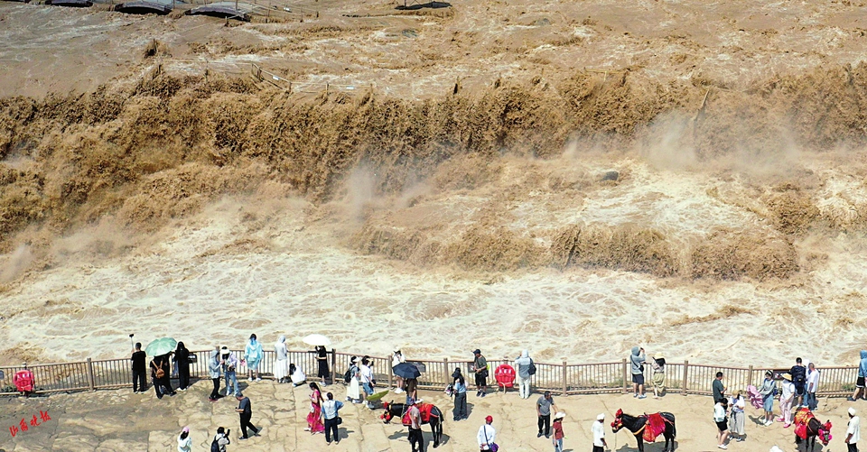 近日,受上游降雨增多及万家寨水库调水调沙放水影响,黄河干流进入汛期。位于晋陕两省交界处的壶口瀑布水量骤增,每秒流量突破1800立方米,主瀑与副瀑连成壮阔一线,昔日分散的水流此刻汇聚成气势磅礴的瀑布群,尽显“黄河之水天上来”的雄浑壮美。这一难得的景观吸引了大批游客慕名而至,争相目睹大自然的磅礴奇观。(记者 马立明 通讯员 吕桂明摄影报道)