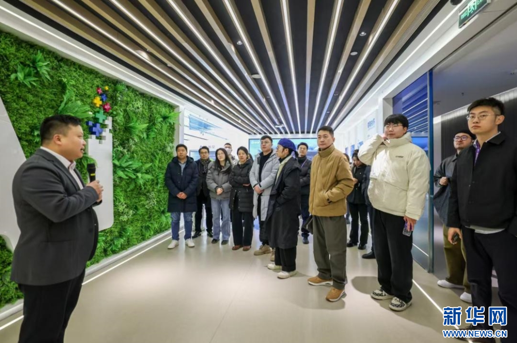 在太原中海国际中心,调研团参观了科大讯飞山西总部基地、太原高途云集教育科技有限公司、优必选科技股份有限公司。图为嘉宾在科大讯飞山西总部基地调研。新华网 发