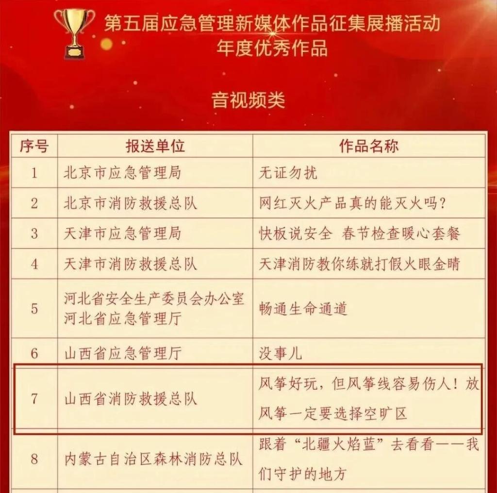 5月9日,应急管理部公布第五届应急管理新媒体作品征集展播活动获奖名单,山西消防报送的短视频作品《风筝好玩,但风筝线容易伤人!放风筝一定要选择空旷区》荣获年度优秀作品奖。