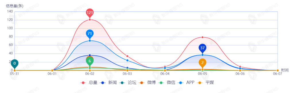 截至目前,该文章在互联网上传播总量共252篇。其中,6月2日是传播的高峰期,共传播121篇文章。各信源的信息发布情况中,app信息占比最大,其次是新闻和微博,占比分别为55.51%、34.29%、5.31%。(数据来源:新华睿思·数媒智慧分析平台)