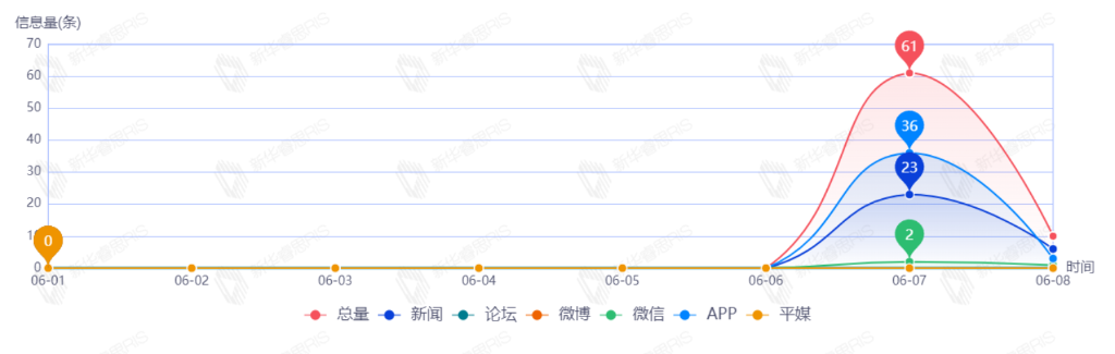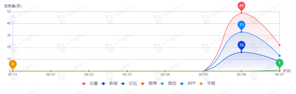 截至目前,该文章在互联网上传播总量共71篇。其中,6月6日是传播的高峰期,共传播49篇文章。各信源的信息发布情况中,app信息占比最大,其次是新闻和微信,占比分别为58.33%、40.00%、1.67%。(数据来源:新华睿思·数媒智慧分析平台)