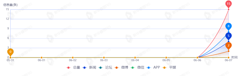 截至目前,该文章在互联网上传播总量共15篇。其中,6月7日是传播的高峰期,共传播15篇文章。各信源的信息发布情况中,新闻信息占比最大,其次是app和微博,占比分别为41.67%、41.67%、16.67%。(数据来源:新华睿思·数媒智慧分析平台)