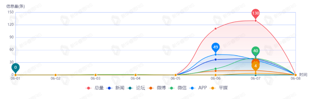 截至目前,该文章在互联网上传播总量共243篇。其中,6月7日是传播的高峰期,共传播130篇文章。各信源的信息发布情况中,新闻信息占比最大,其次是app和微信,占比分别为33.93%、29.46%、25.45%。(数据来源:新华睿思·数媒智慧分析平台)