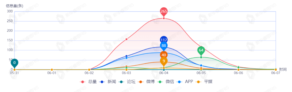 截至目前,该文章在互联网上传播总量共558篇。其中,6月4日是传播的高峰期,共传播265篇文章。各信源的信息发布情况中,新闻信息占比最大,其次是app和微信,占比分别为38.53%、28.99%、18.35%。(数据来源:新华睿思·数媒智慧分析平台)